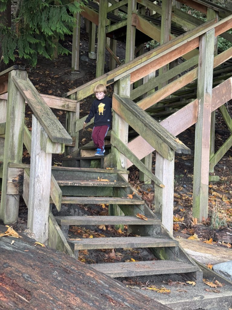 The weather in Nanaimo has been rainy and dark all week. Leaving the house around noon today, the streetlights were still on. After being stuck inside for days, we really needed the fresh air. The walk down the stairs, the climb back up, and the short time on the beach gave us exactly the break we were looking for.