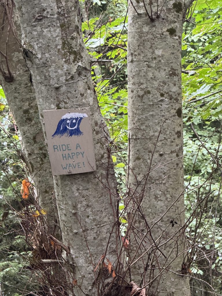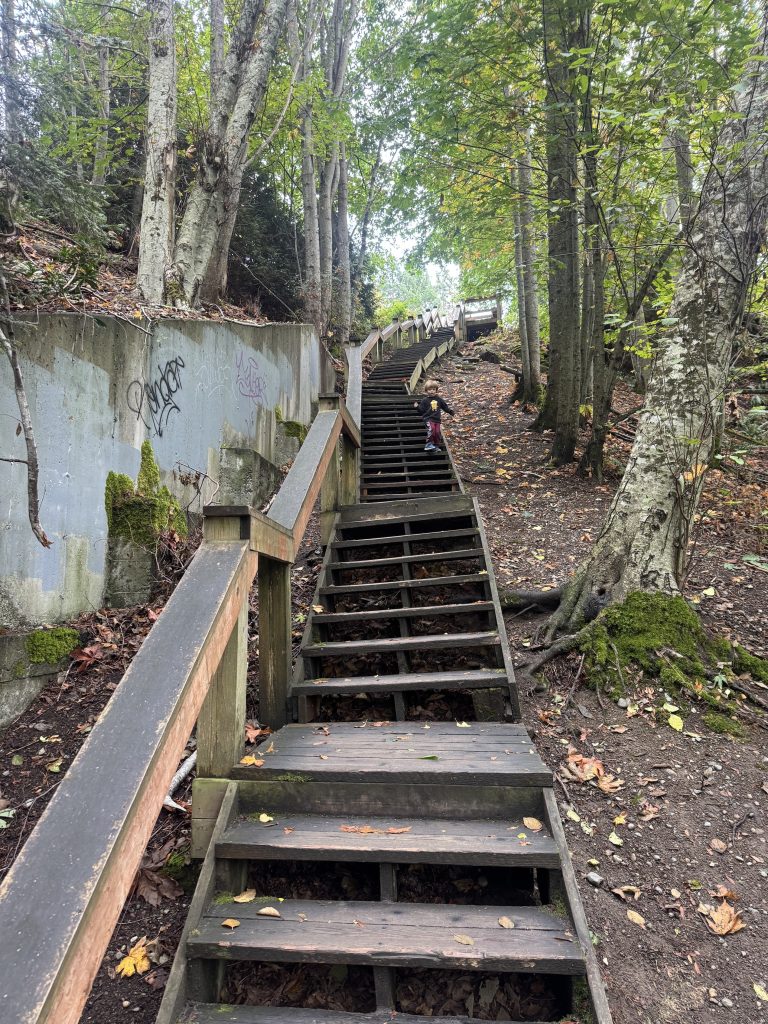 Accessing Blueback Beach Nanaimo means committing to the stairs. There are many of them—long wooden staircases that wind down through the rainforest. The walk down is easier, and along the way you can enjoy the beauty of the trees and even spot positive messages painted along the trail.