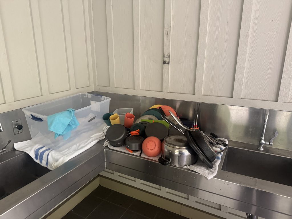 One lesson we’ve learned is to never leave dish soap sitting loose in the dish bin. If it spills, the taste of soap will coat your dishes and utensils, leaving you stuck rinsing and scrubbing everything. Always seal dish soap in a zip bag or separate container to avoid a frustrating cleanup.