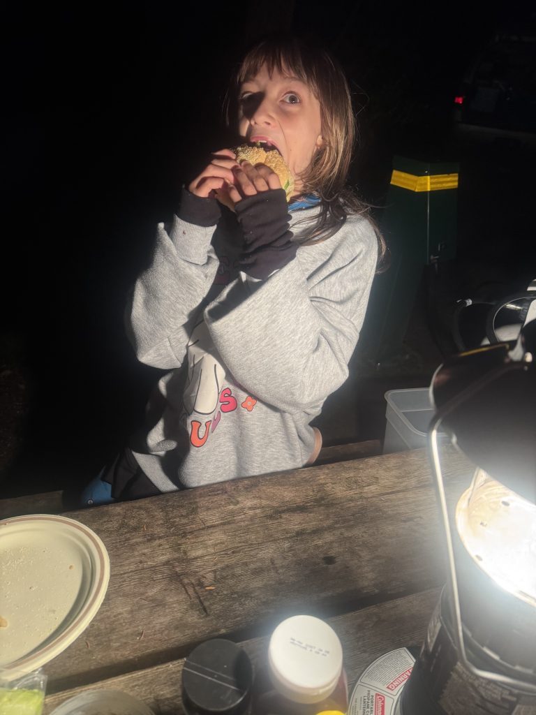 For this trip, we enjoyed burgers, tacos, and chili. All were prepared in advance, so they required almost no cooking at camp. This method saved time, limited cleanup, and made dinner the easiest part of the day.